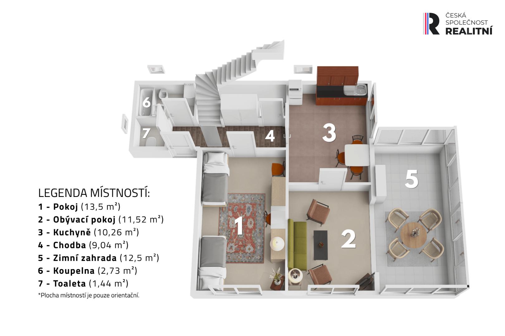 + 1. patro nabízí obývací pokoj se zimní zahradou, kuchyni, ložnici, koupelnu s bidetem a samostatnou toaletu